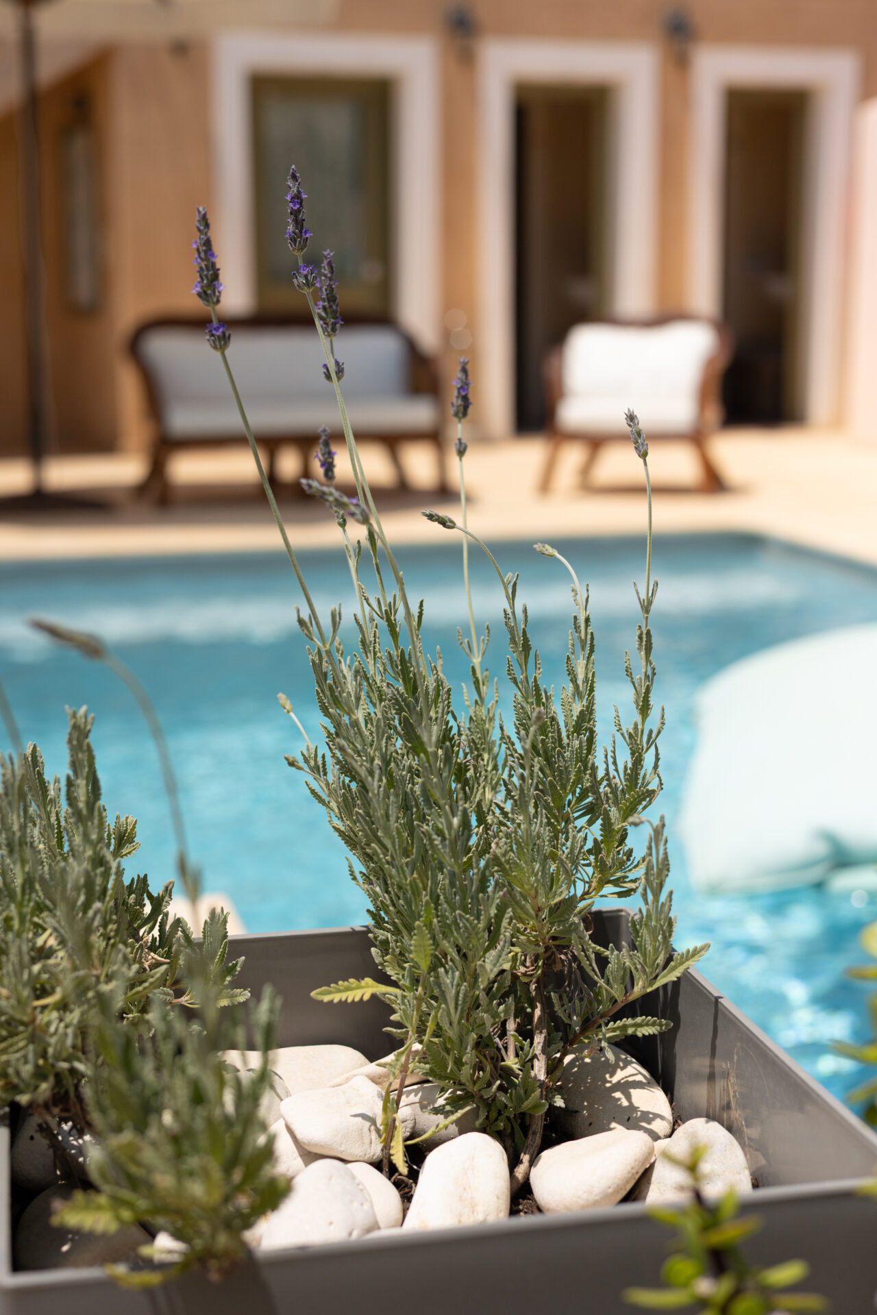 The downstairs consists of fully-equipped kitchen, WC and lounge leading out onto a private, shaded terrace with beautiful views and access to the pool. The lounge has two adult-sized sofa-beds for extra guests. The pool is serviced by two separate bathrooms and shower facilities. Pool towels are also provided.