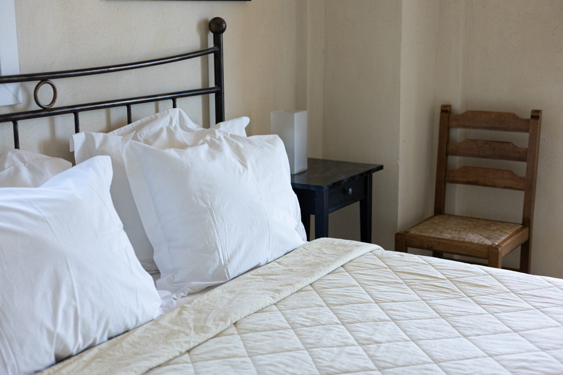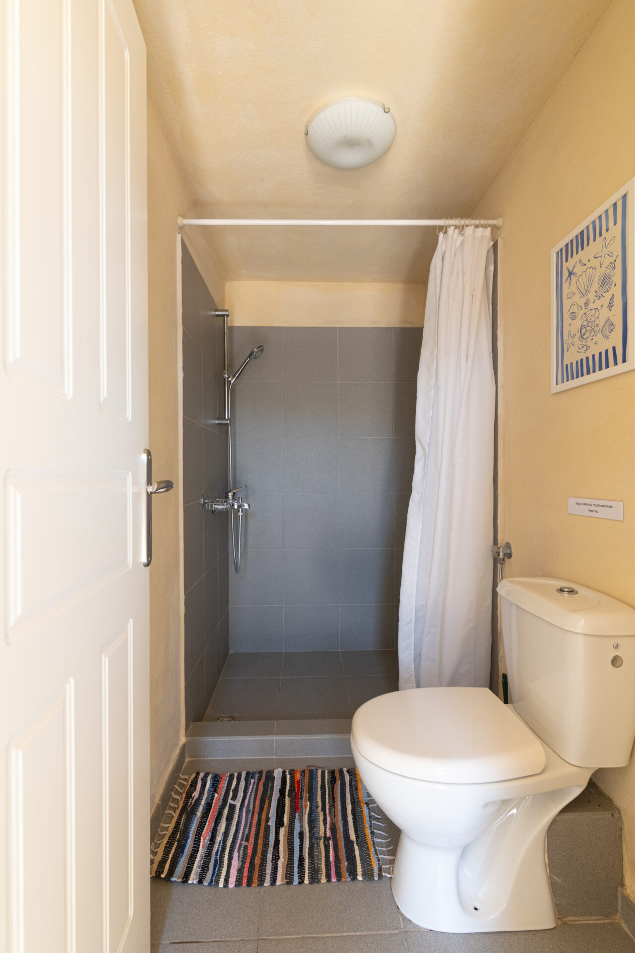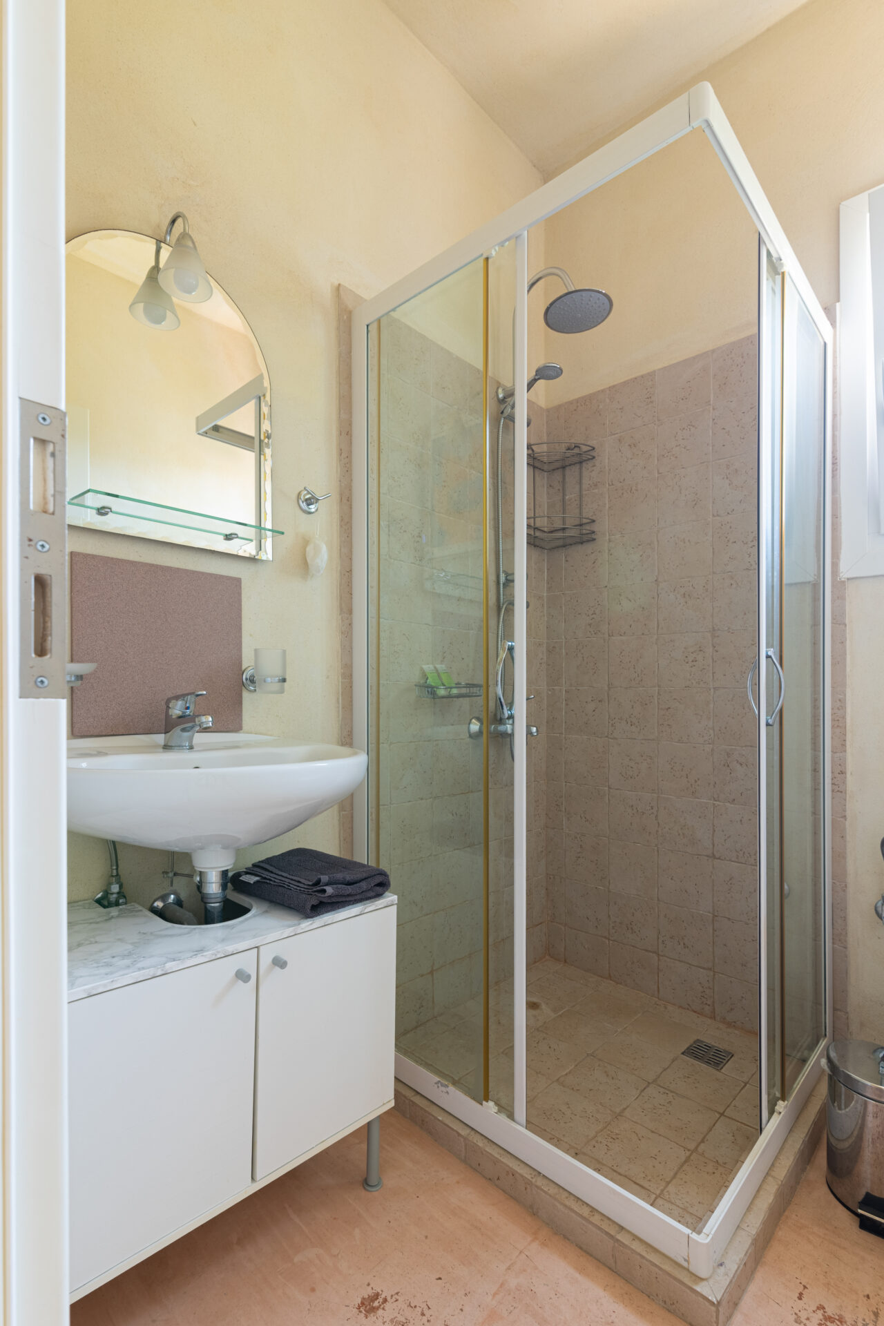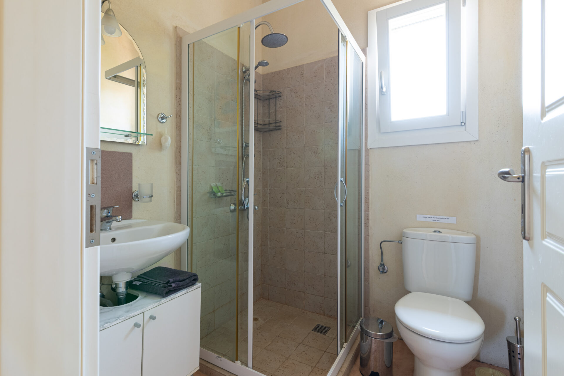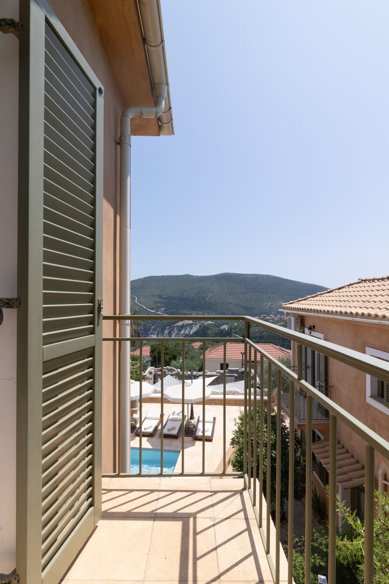 The downstairs consists of fully-equipped kitchen, WC and lounge leading out onto a private, shaded terrace with beautiful views and access to the pool. The lounge has two adult-sized sofa-beds for extra guests. The pool is serviced by two separate bathrooms and shower facilities. Pool towels are also provided.