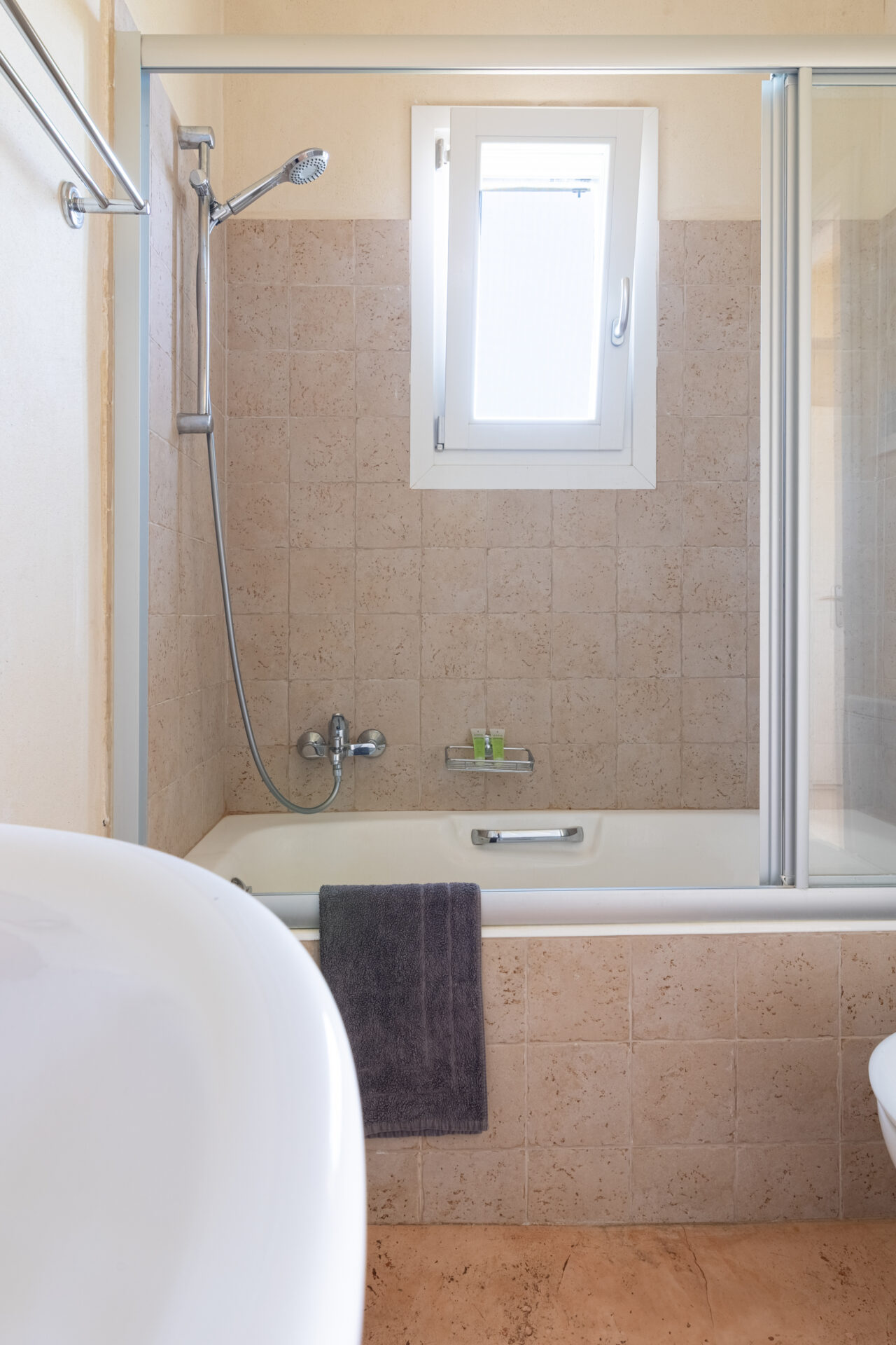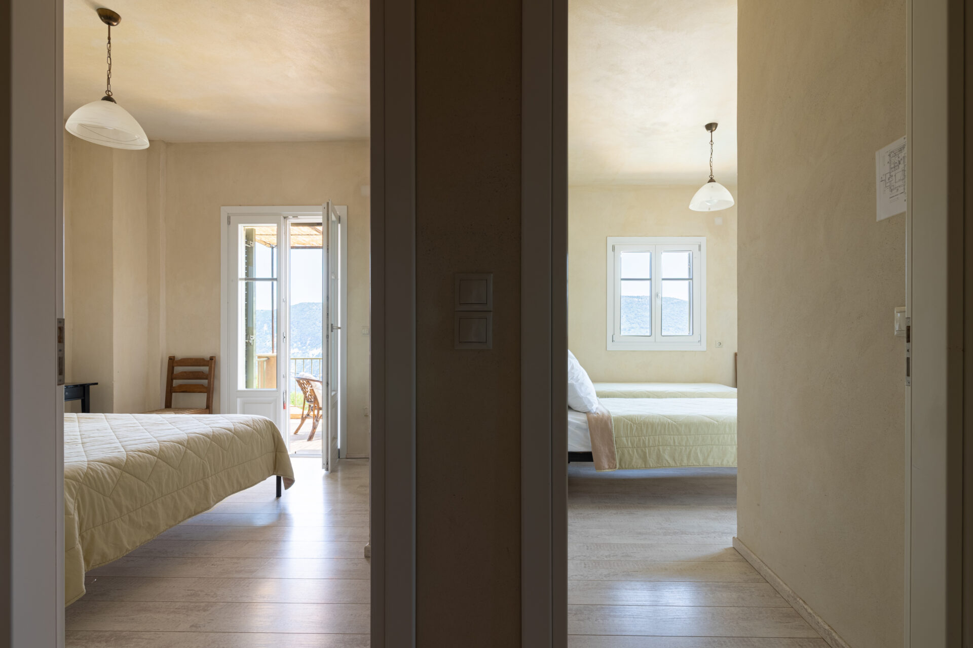 The upstairs of each villa consists of two spacious bedrooms leading onto balconies with sea and mountain views. The master bedroom with King-size bed has an en-suite bathroom with bathtub/shower while the second bedroom, with two single beds, makes use of the family bathroom, with shower on the landing.